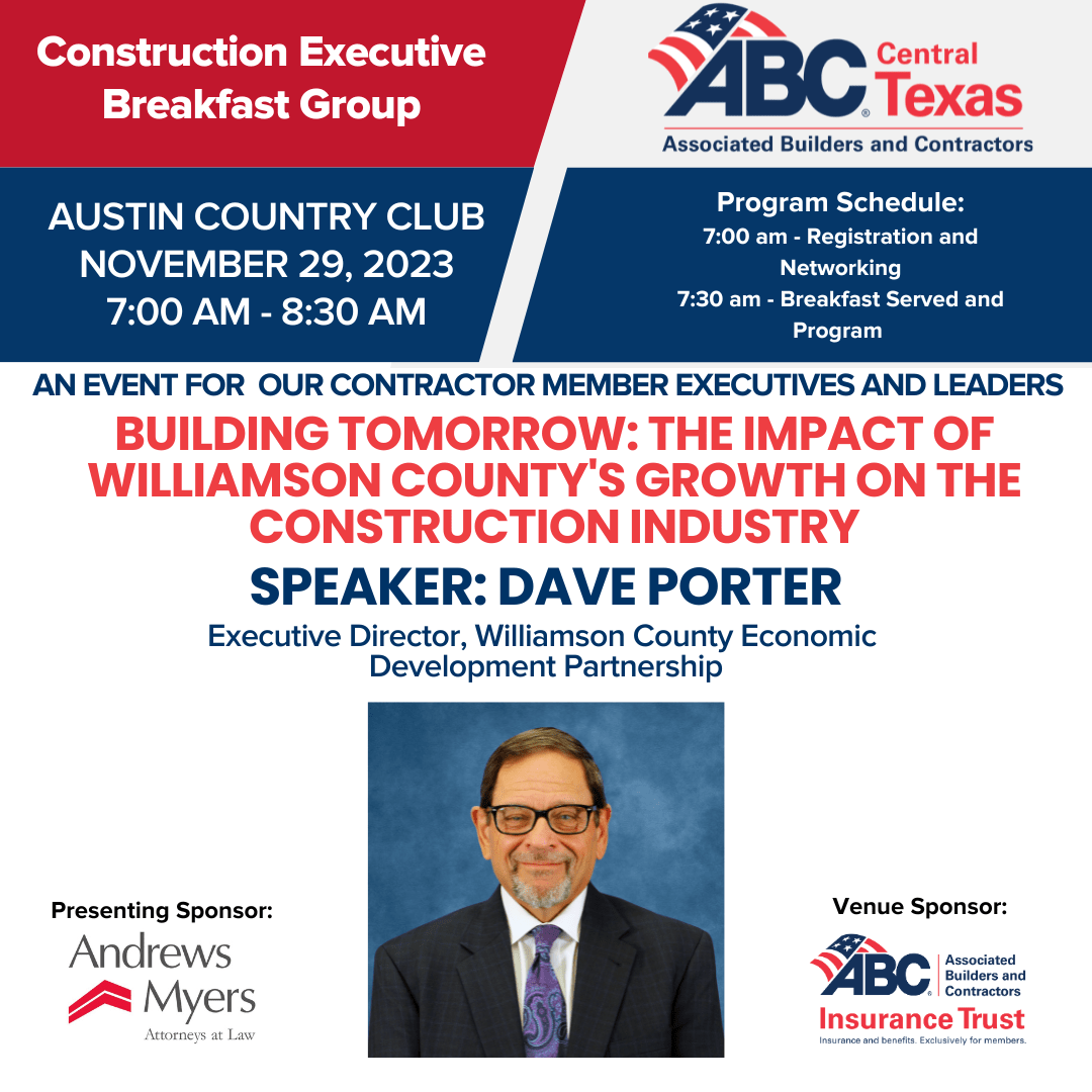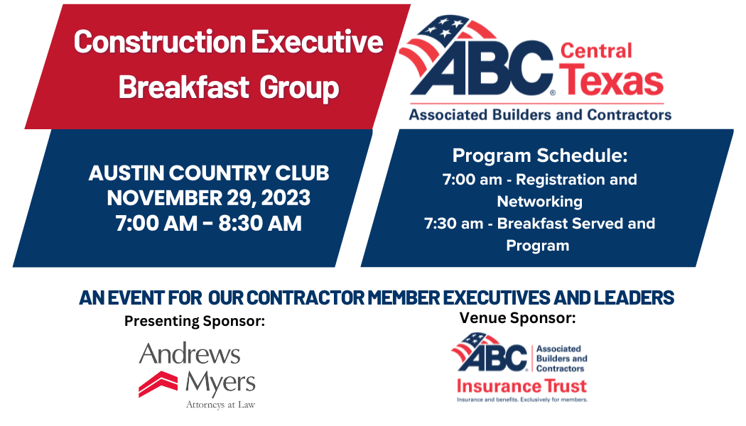 Join construction executives from Central Texas as we hear from speakers that address the needs and concerns of contractors. This quarterly event is invitation only.